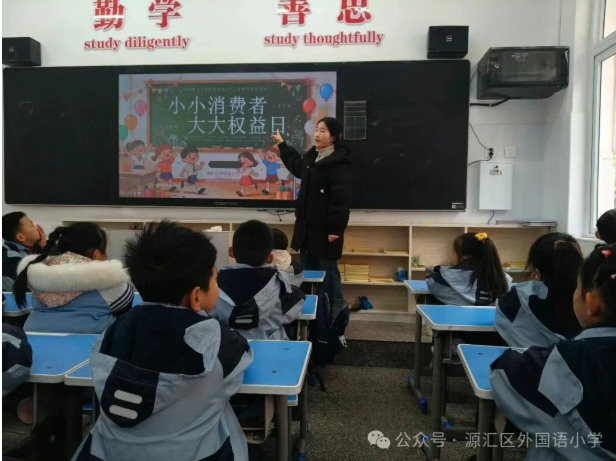 班队课上,班主任们运用卡通图片、短视频、生活案例、情景模拟等孩子们喜闻乐见的形式,拆解维权知识点:从辨别文具、零食、玩具的真伪,到拒绝虚假宣传、理性消费;从牢记基础维权热线,到学会保留消费凭证、主动向家长老师求助,一步步引导孩子们掌握基本的自我保护技能。同时,围绕“校园诚信”展开深入讨论,结合作业独立完成、考试不作弊、说话守承诺、借物及时还等日常小事,让同学们明白诚信蕴含在点滴言行之中,诚信做人比成绩优异更重要。